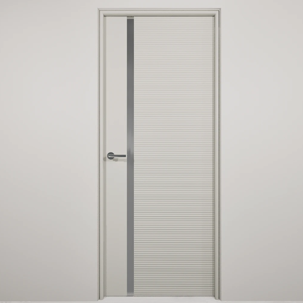 Полотно-каркас массив сосны, облицованный с 2х сторон монолитной плитой МДФ, с Горизонтальной фрезеровкой и зеркалом. Покрытие-Эмаль. Полотно 400 мм. изготавливается без зеркала.