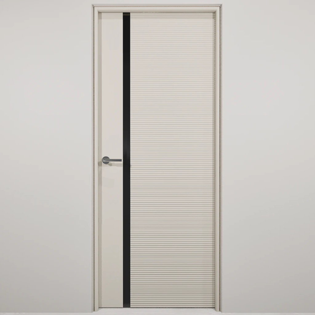 Полотно-каркас массив сосны, облицованный с 2х сторон монолитной плитой МДФ, с Горизонтальной фрезеровкой и зеркалом. Покрытие-Эмаль. Полотно 400 мм. изготавливается без зеркала.