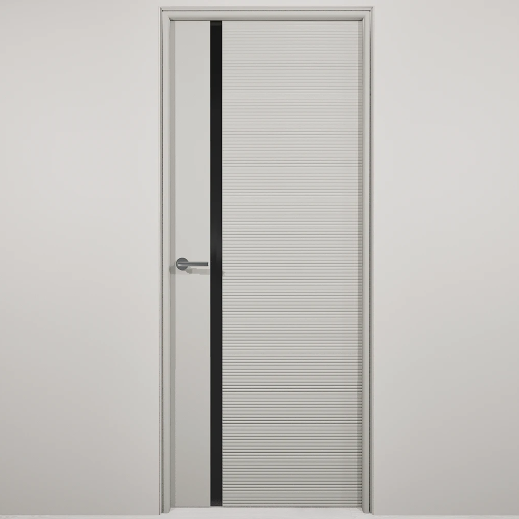 Полотно-каркас массив сосны, облицованный с 2х сторон монолитной плитой МДФ, с Горизонтальной фрезеровкой и зеркалом. Покрытие-Эмаль. Полотно 400 мм. изготавливается без зеркала.